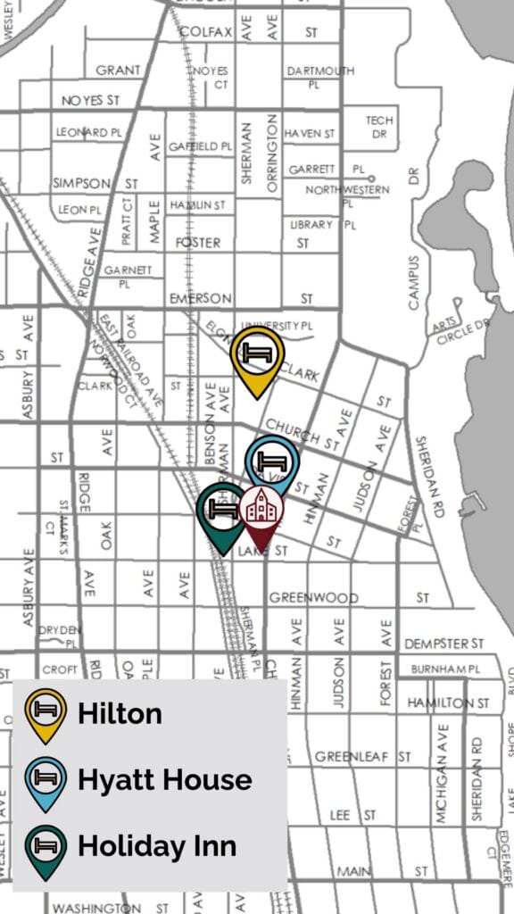 For this year’s gathering, we do not have one designated conference hotel. Instead, we are offering several lodging options in the heart of downtown Evanston. Each hotel is a 2–10 minute walk to Lake Street Church, putting you close to the gathering space as well as coffee shops, restaurants, and neighborhood amenities. This setup allows everyone to choose what works best for their budget, accessibility needs, and travel preferences.